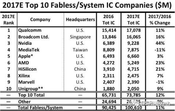 2017 年全球前十大Fables s IC 设计厂商(百万美元)