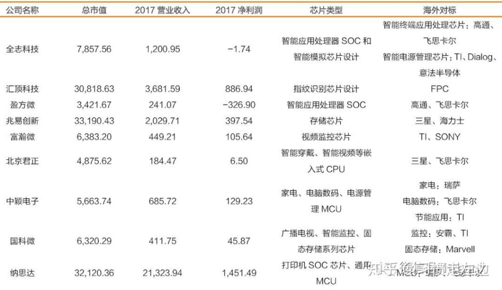 总的来看,芯片设计的上市公司,都是在细分领域的国内最强。比如2017 年汇顶科技在指纹识别芯片领域超越FPC 成为全球安卓阵营最大指纹IC 提供商,成为国产设计芯片在消费电子细分领域少有的全球第一。士兰微从集成电路芯片设计业务开始,逐步搭建了芯片制造平台,并已将技术和制造平台延伸至功率器件、功率模块和MEMS 传感器的封装领域。但与国际半导体大厂相比,不管是高端芯片设计能力,还是规模、盈利水平等方面仍有非常大的追赶空间。
