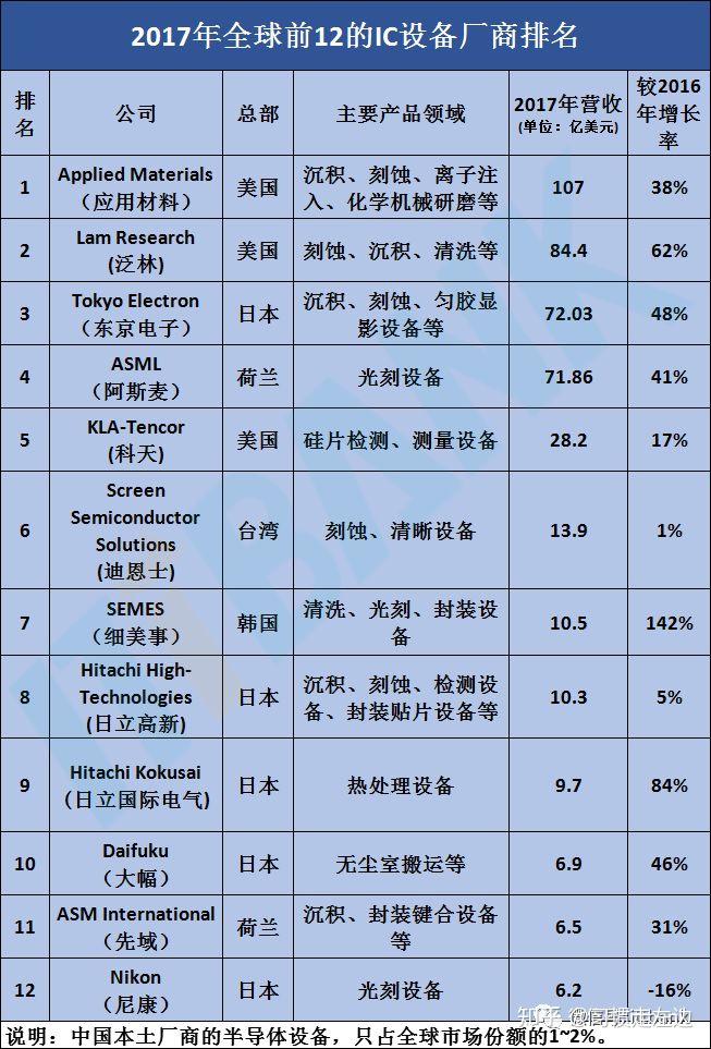 中国半导体设备国产化率低,本土半导体设备厂商市占率仅占全球份额的1-2%。