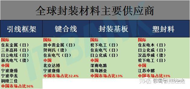 日美德在全球半导体材料供应上占主导地位。各细分领域主要玩家有:硅片——Shin-Etsu、Sumco,光刻胶——TOK、Shipley,电子气体——Air Liquid、Praxair,CMP——DOW、3M,引线架构——住友金属,键合线——田中贵金属、封装基板——松下电工,塑封料——住友电木。